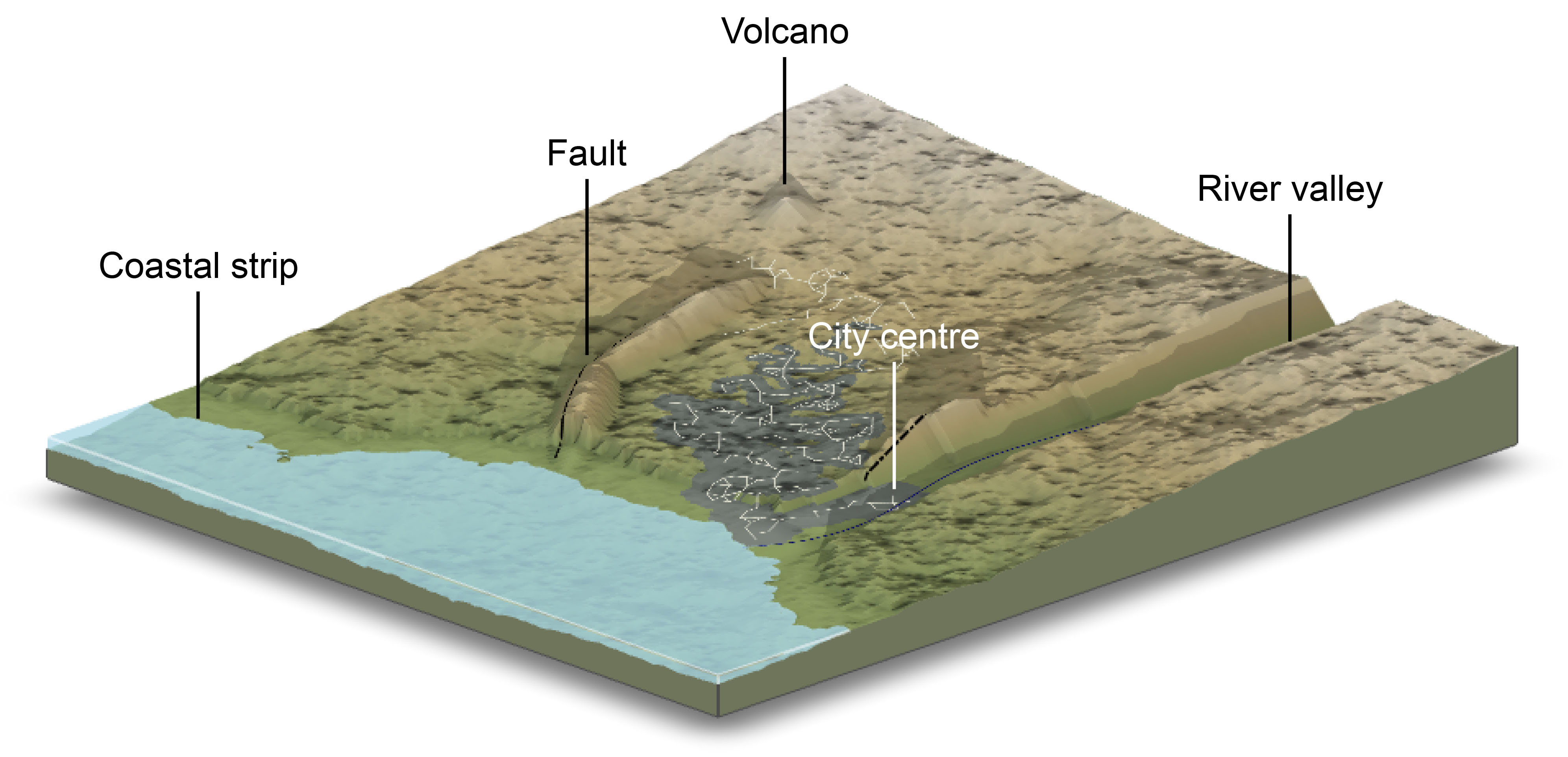 Example of a virtual environmental in the GenMR digital template - Rendered with Rayshader (by T. Morgan-Wall). In version 1.1.1, the digital template is identical to that developed for the CAT Risk Modelling Sandbox, part of the Cambridge University Press textbook Introduction to Catastrophe Risk Modelling - A Physics-based Approach (Mignan, 2024).