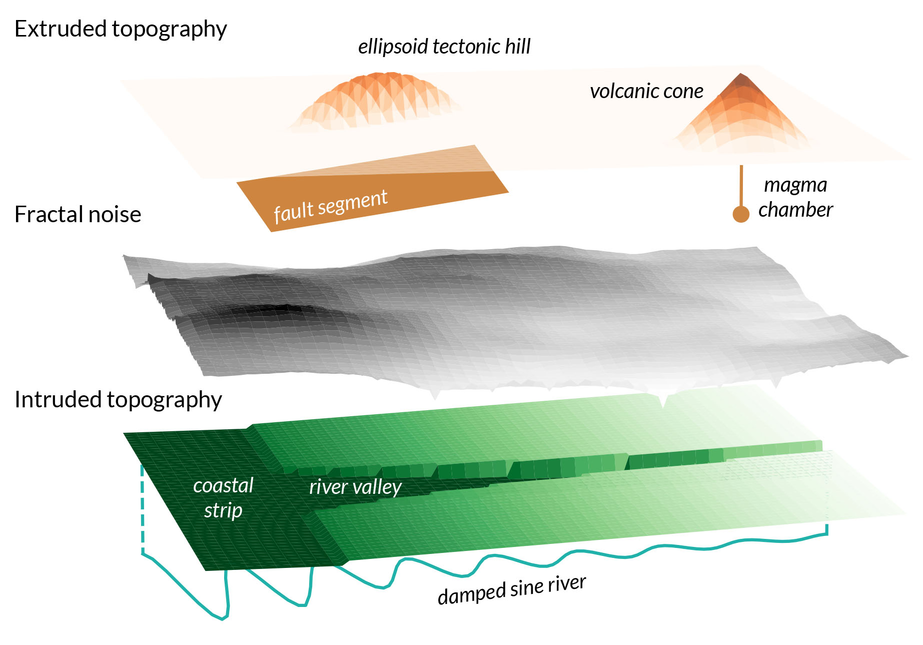 The topography layer (parameterized in topoPar) is defined with the elevation \(z(x,y)\) as its main variable. It is constructed at a lower granularity with pixel width gridPar['w'] * lores_f. The process takes several successive steps: